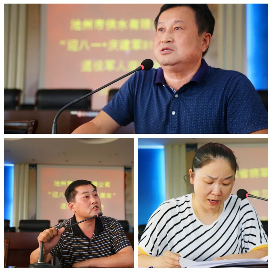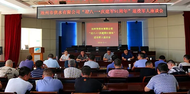| 為喜迎中國人民解放軍建軍91周年,2018年8月1日上午,池州市供水有限公司副總經理包洪全和王忠榮一行對池州市邊防檢查站進行了駐地慰問,并對全體官兵致以節日的問候。      當天下午,為慶祝中國人民解放軍建軍91周年 ,池州市供水有限公司召開退役軍人座談會,公司領導班子、各部門負責人、全體退役軍人參加會議。   會議伊始,由副總經理王忠榮帶領參會人員認真學習了《安徽省擁軍優屬條例》,隨后,由公司退役軍人代表發言,暢談自身的軍旅生涯,并結合現任工作內容談談自身感想。     退役軍人劉宏表示,作為一名退役軍人,他感到特別的光榮和自豪,與此同時,作為一名水務人更是深刻的感受到了肩上的責任。在今后的工作中,要繼續發揚人民軍隊的優良作風和光榮傳統,為池州供水事業的蓬勃發展貢獻一份力量; 退役軍人齊勇躍在發言中說,我們聚是一團火,散是滿天星。供水公司為我們退役軍人提供了施展才華的舞臺,我們也應該將部隊的優良傳統帶入自己的崗位,用軍人的作風落實工作,為公司的發展譜寫新的篇章。 退役軍人尤勇勝帶領大家回顧了他為南海守島礁的軍旅生涯,并詳細介紹了守島戰士是如何與惡劣環境進行抗爭,保衛祖國的南海邊疆。 退役軍人周志剛表示,三年的軍旅生涯讓他受益匪淺,部隊的生活雖然很枯燥,訓練甚至很殘酷,但是也磨煉了意志,強健了體魄。在參加工作以后,部隊的優良傳統一直指引著他在水務崗位上不斷奮進,為水務事業的發展發熱發光。  退役軍人丁士林在發言中說,感謝公司領導長期以來對退役軍人的尊重、理解和支持,作為一名退役軍人,最好的表達方式就是用軍人的精神來激勵人生,用軍人的作風來落實工作。在今后的工作中,要積極發揮軍人的模范帶頭作用,努力成為本崗位的骨干和人才。