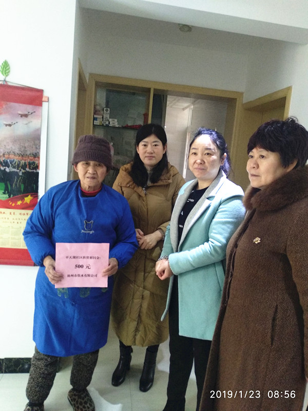 隨著春節(jié)的臨近,為幫助社區(qū)特困戶度過一個(gè)安靜祥和的新年,1月23日上午,池州市供水有限公司副經(jīng)理王忠榮帶隊(duì)對(duì)東湖社區(qū)、平天湖社區(qū)特困戶進(jìn)行了新春慰問。