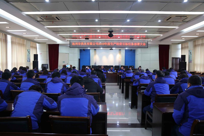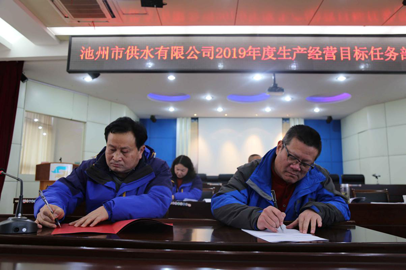 | ——池州市供水有限公司召開新年工作目標任務部署大會   2月19日、農歷正月十五,池州市供水有限公司2019年度生產經營目標任務部署大會如期舉行,公司全體員工100余人參加會議。會議下達了新一年主要生產經營指標、年度重點工作、主要工作及部門重點工作任務,并簽訂了安全生產、經營目標、黨建工作及黨風廉政目標責任書。會議提振了精神、鼓舞了士氣,為新一年工作開好局、起好步打下了堅實基礎。   總經理吳小平用《2019,一起拼搏、一起奮斗》全面部署2019年各項生產經營目標任務。他指出:2019年是新中國成立70周年,是中華民族實現全面小康的關鍵一年,為了更美好的未來,為了中華民族偉大復興的夢想,我們供水人不能有絲毫懈怠,只有奮斗才有穩穩的幸福。他強調,2019年,我們要“聚力‘黨建、保障、創新、服務、效益’五大關鍵環節,勤思便民之策,厚植發展之基,全力以赴開創池州水務工作新局面”,要將股東單位下達的9項年度重點工作、公司分類、細化的45項主要工作及各部門上報的重點工作逐項梳理,一一落實。   他要求,新的一年,我們要深入改變工作作風,不斷提升工作效能,要在自我本領上再提升,對自己負責的工作落實不好、不到位時要自問四個有沒有:一問自己有沒有追求卓越的境界、二問自己有沒有應迎難而上的擔當、三問自己有沒有一抓到底的激情、四問自己有沒有常抓不懈的執著;他進一步要求,近期,我們一要強力啟動,嚴肅考績,全面開啟新工作;二要聚焦關鍵環節、個個擊破,確保干一件成一件,做好產銷差、城鄉供水和老舊小區二次供水泵房改造等年度三件大事;三要奮力拼搏、平凡但不平庸,不負我們偉大的時代。   會上,董事長鐘誠簽署了《生產經營單位主要負責人安全生產主體責任承諾書》,與總經理簽訂了安全生產“一崗雙責”目標責任書,同時作為黨支部書記與各小組長簽訂《黨建工作目標責任書》、與各部門負責人簽訂《黨風廉政目標責任書》;總經理與各部門負責人簽訂《2019年部門經營目標責任書》,并與分管經理、部門層層簽訂《安全生產“一崗雙責”目標責任書》。