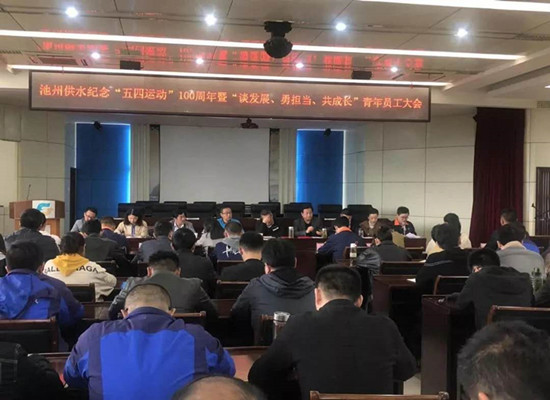 2019年4月29日下午3點,池州供水公司全體高管、各部門負責人、廣大青年員工,齊聚一堂,召開“談發展 勇擔當 共成長”青年員工大會,會議由公司黨支部青年委員、副總經理王忠榮主持。 公司全體高管的到會,給予青年員工極大的鼓勵,希望廣大青年員工繼承和發揚五四光榮傳統,弘揚愛國、愛司的五四精神,充分發揮青年人敢為人先、勇于創新的進取精神,做公司的中流砥柱,為公司健康發展做出新的更大的貢獻。