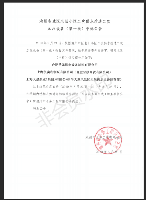 | 池州市城區(qū)老舊小區(qū)二次供水改造二次 加壓設(shè)備(第一批)中標(biāo)公告 | |