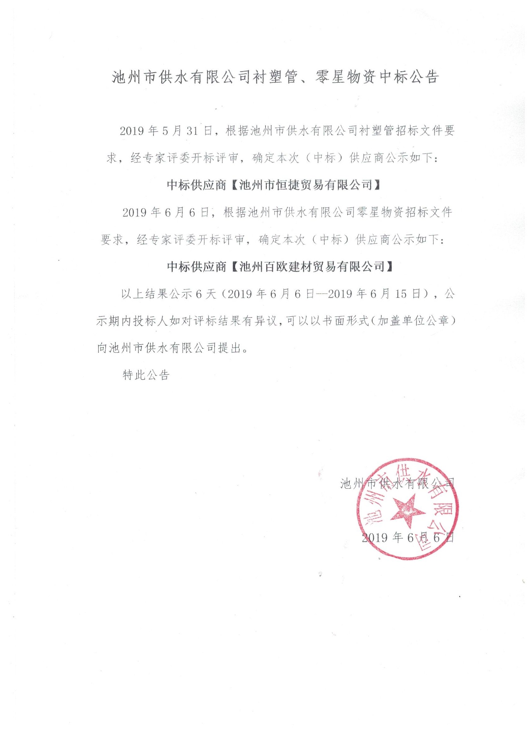 | 池州市供水有限公司襯塑管、零星物資中標(biāo)公告 | |