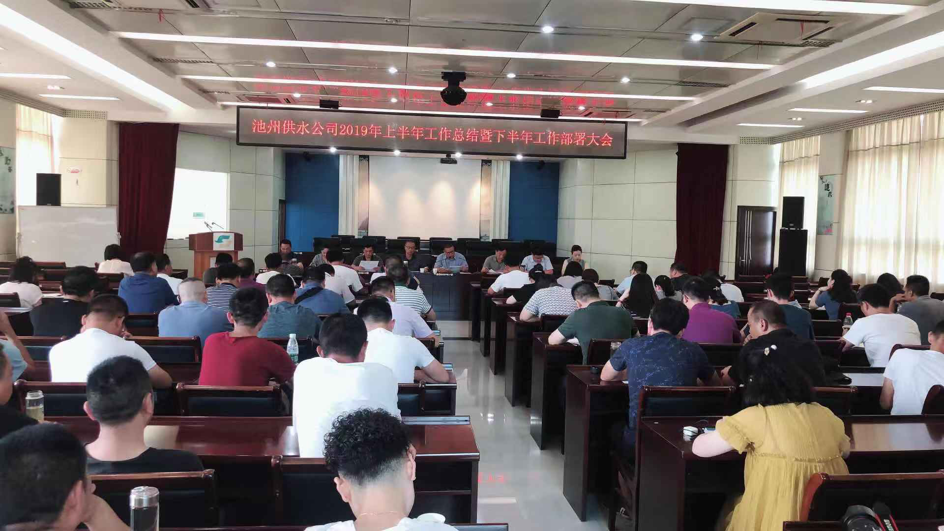 | ——池州供水公司召開2019年上半年工作總結暨下半年工作部署會   2019年7月31日下午,池州供水公司在四樓會議室召開上半年工作總結暨下半年工作部署會,公司全體員工100余人參加了會議。   首先,由公司總經理吳小平作題為《咬定目標 奮力奔跑 扛起高質量發展的實干擔當》的報告。報告圍繞經營業績、經營管理、創新管理、重點工作、黨建統領及存在的問題六個方面全面總結回顧了公司上半年的各項工作,客觀分析了上半年各項重點工作的完成情況,并對下半年的工作從做出重要部署,他指出,下半年公司要持續強化黨的領導,打造五星黨支部;持續優化安全優質供水,切實做好供水保障;持續強化基礎管理,優化公司平穩運營;持續發力控差減損,千方百計創收增效;持續做好客服營銷管理,提升服務品質;全力做好6S管理,提升現場管理水平持續做好城區二次供水泵房改造,穩步推進城鄉供水一體化發展;持續加強文明創建、企業文化建設等工作;多渠道解決現金流緊缺問題;同時要提前謀劃下一年度工作任務。
