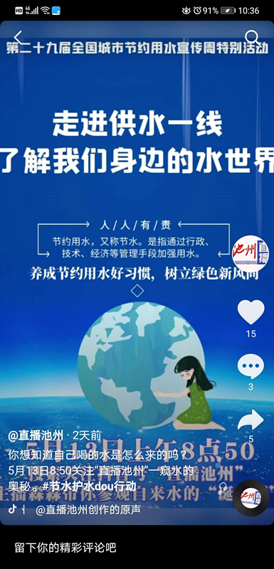 “使用抖音直播等宣傳工具是我們基于疫情防控需要的慎重考慮,同時也是抓住時代脈搏、跟上新興媒體做好宣傳工作的有益嘗試,我們最終愿望是希望更多人的能珍惜水資源、養(yǎng)成節(jié)約用水好習慣”,池州供水公司相關領導接受采訪時表示,“同時,我們希望一直以來關心、愛護我們的社會各界領導、用戶和好朋友們能更深入、細致、直觀的了解我們,一如既往地支持我們,同時,我們也用這樣的方式告訴更多的人,奮斗,我們一直在路上。”