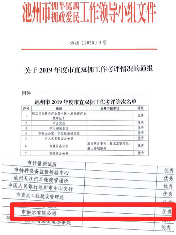 | 池州供水公司連續三年獲池州市雙擁優秀單位榮譽稱號 | |