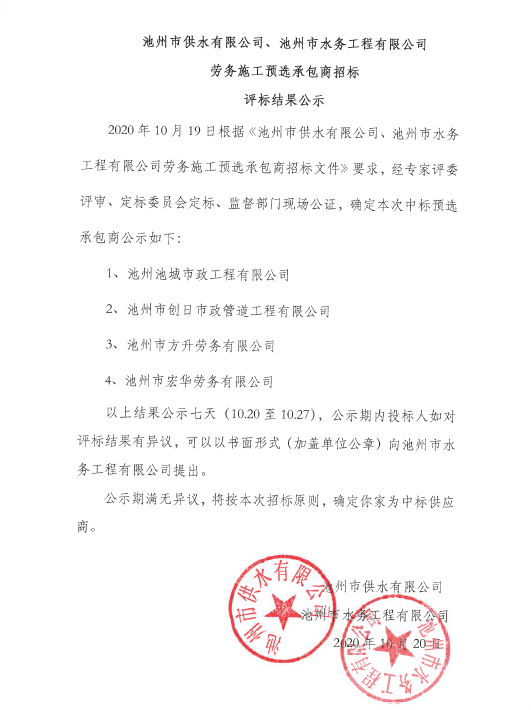 | 池州市供水有限公司、池州市水務工程有限公司勞物施工預選承包商招標評標結果公示 | |