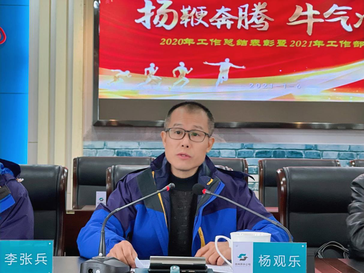 董事長楊觀樂作《銳意改革 勇往直前 奮力開啟高質(zhì)量發(fā)展新征程》的主旨講話。他充分肯定了公司2020年取得的各項工作成績,他強(qiáng)調(diào)2021年,公司要更加堅定不移地以習(xí)近平新時代中國特色社會主義思想和黨的十九大、十九屆二中、三中、四中、五中全會精神為指引,聚焦水價調(diào)整和內(nèi)部改革,抓好戰(zhàn)略規(guī)劃、重點(diǎn)工作,真抓實干、埋頭苦干,全面提升“五項”能力(經(jīng)營管理、供水保障、用戶服務(wù)、業(yè)務(wù)拓展、創(chuàng)新發(fā)展),努力實現(xiàn)高質(zhì)量、可持續(xù)發(fā)展。他指出我們要:勇立潮頭、領(lǐng)航前行,推動公司發(fā)展躍上新的歷史臺階;強(qiáng)基固本、安全保供,把穩(wěn)城市發(fā)展新的供水航舵;實事求是、科學(xué)規(guī)劃,打造供水行業(yè)新的標(biāo)桿典范;鼓瑟齊鳴、真誠為民,講好新格局下的“池州供水故事”;改革創(chuàng)新、破局開路,譜寫供水高質(zhì)量發(fā)展新的輝煌篇章。