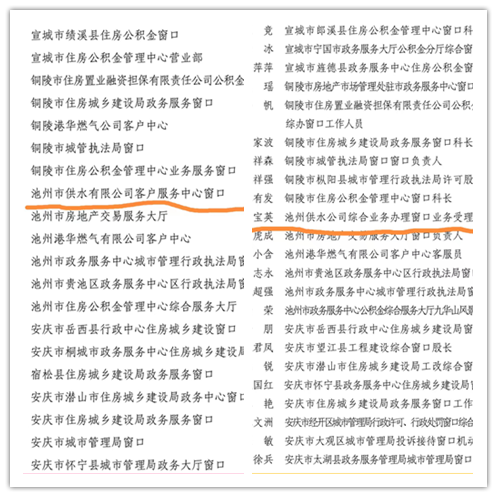 近日,省文明辦、省住房城鄉建設廳下發的《關于在全省住房城鄉建設系統開展文明服務窗口創建和文明服務標兵選樹活動的通知》(建會函〔2021〕898 號),池州市供水有限公司客戶服務中心被評為2021年度全省住房和城鄉建設系統“文明服務窗口”稱號,唐寶英同志榮獲“文明服務標兵”稱號。