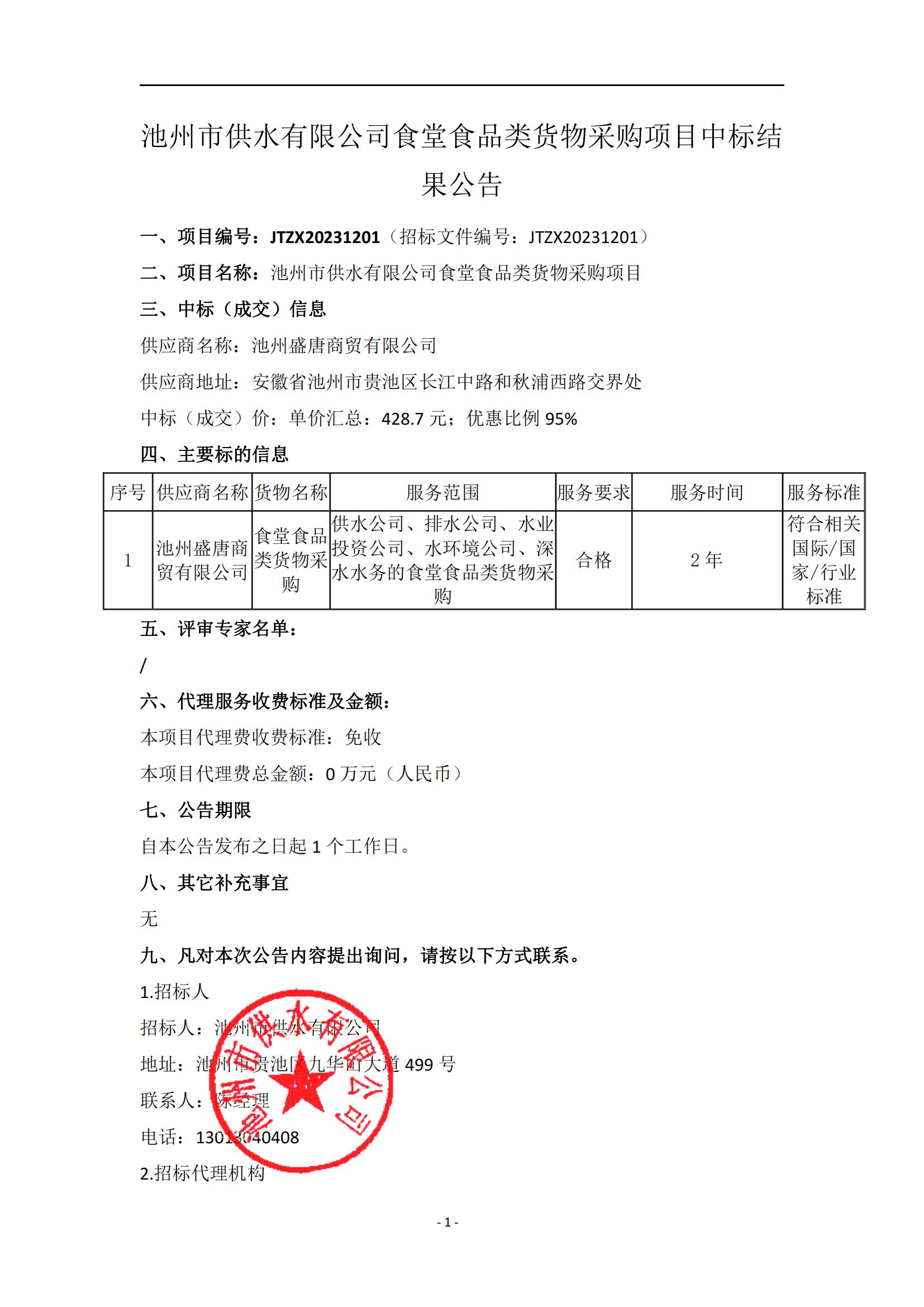 | 池州市供水有限公司食堂食品類貨物采購項目中標結果公告 | |