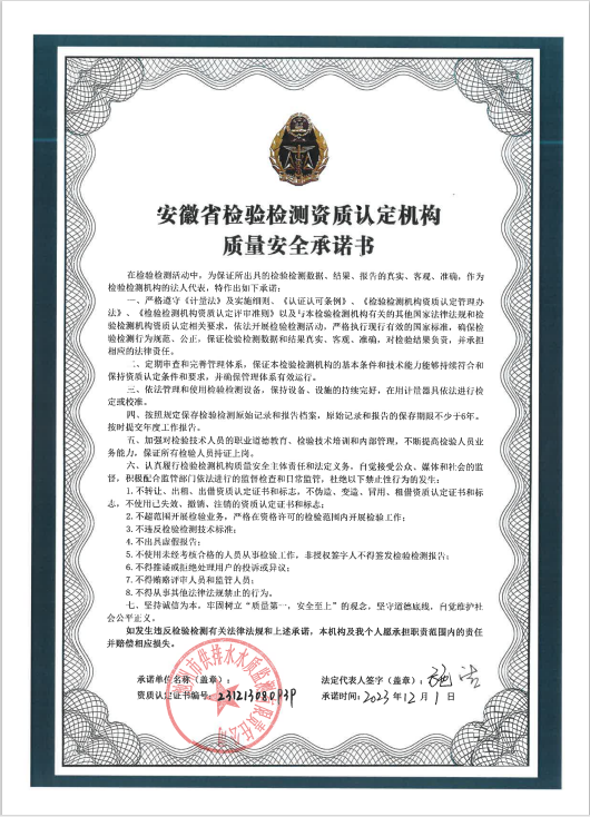 | 池州市供排水水質監測有限責任公司質量安全承諾書 | |