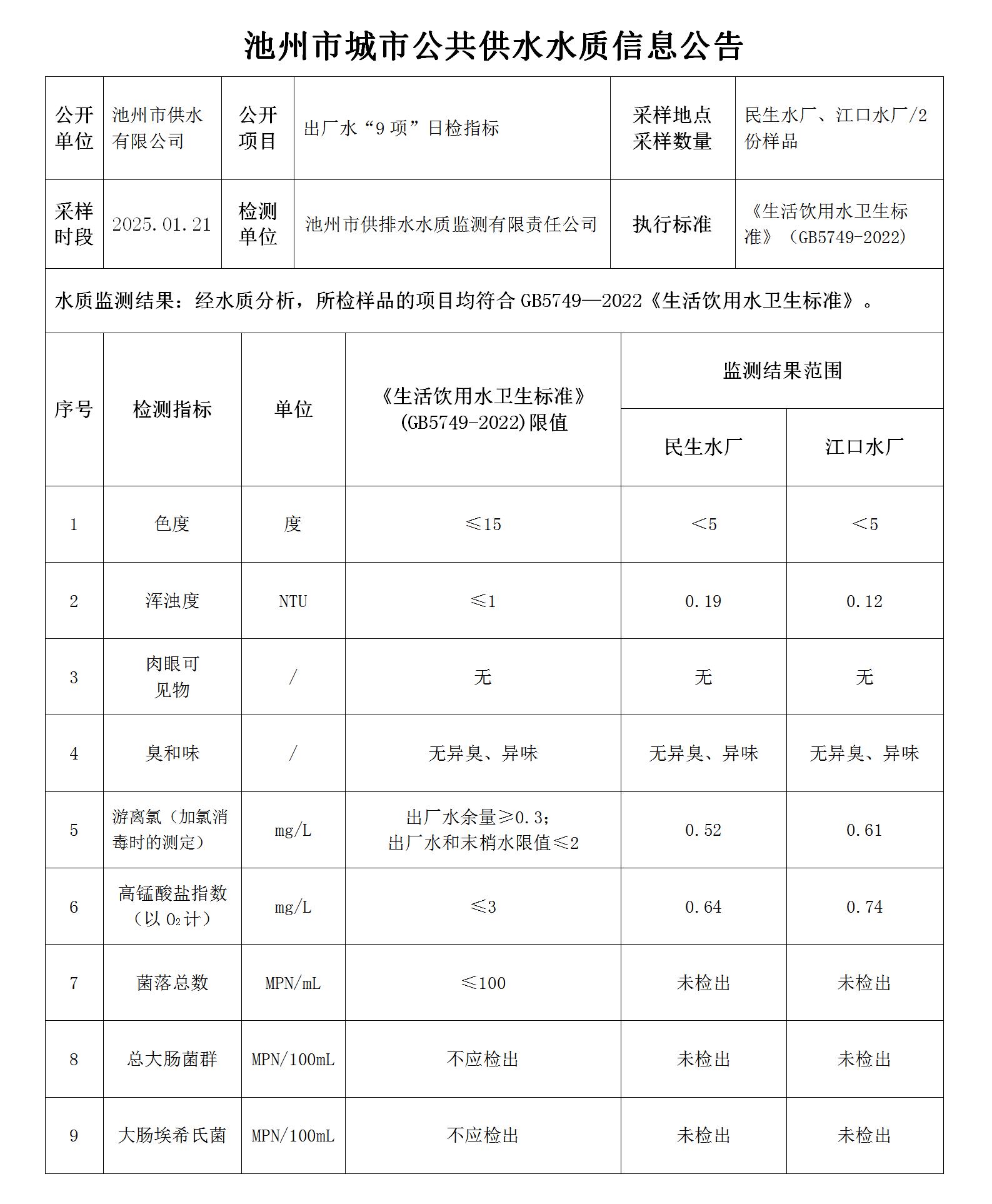 | 池州市城市公共供水水質信息公告出廠水“9項”日檢指標2025.01.21 | |