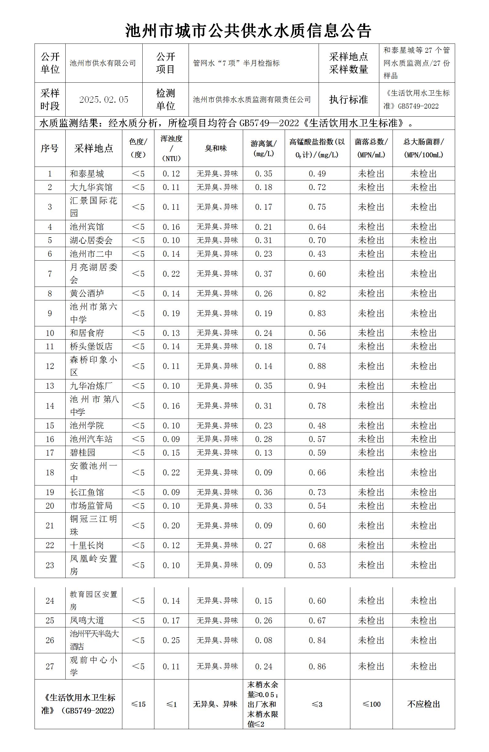 | 池州市城市公共供水水質信息公告管網水“7項”半月檢指標2-1 | |
