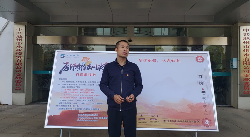 食為政首,糧安天下,為深入貫徹落實習近平總書記對制止餐飲浪費行為作出的重要指示精神,響應國家安全戰略,進一步弘揚中華民族勤儉節約的傳統美德,牢固樹立節約光榮、浪費可恥的意識,11月9日上午8點,市供水有限公司聯合池州水業、池州排水、池州水環境公司在供水公司大樓前簡單而隆重地開展“厲行節約,反對浪費”簽名承諾活動。